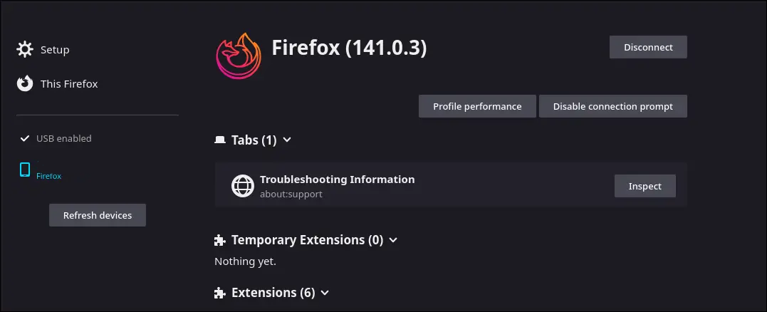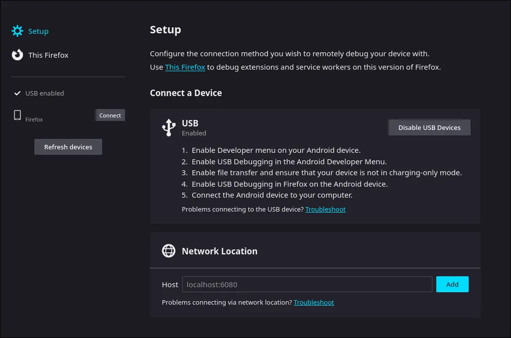- Enable remote debugging via USB in Firefox on Android (it is in settings at the bottom)