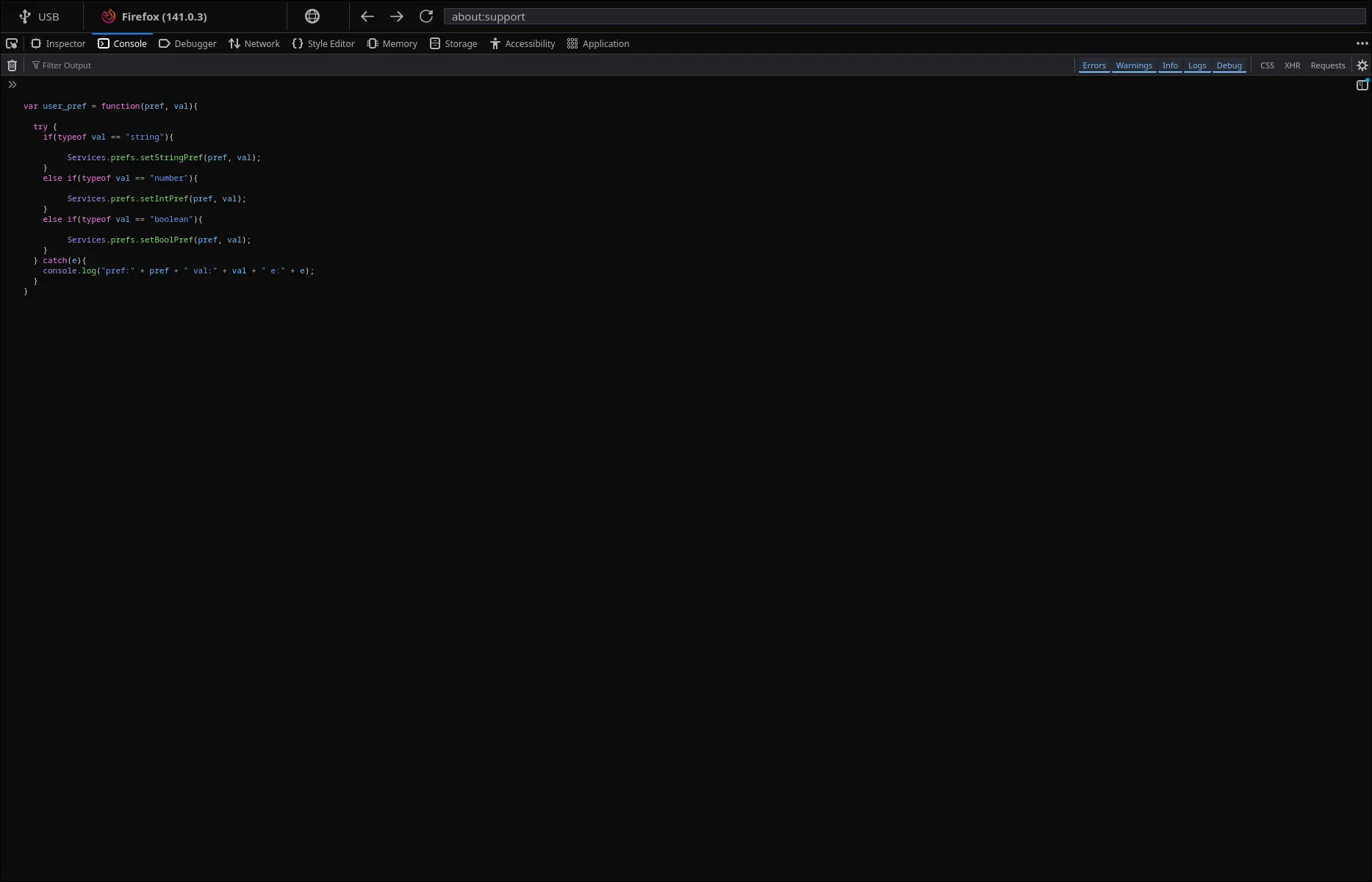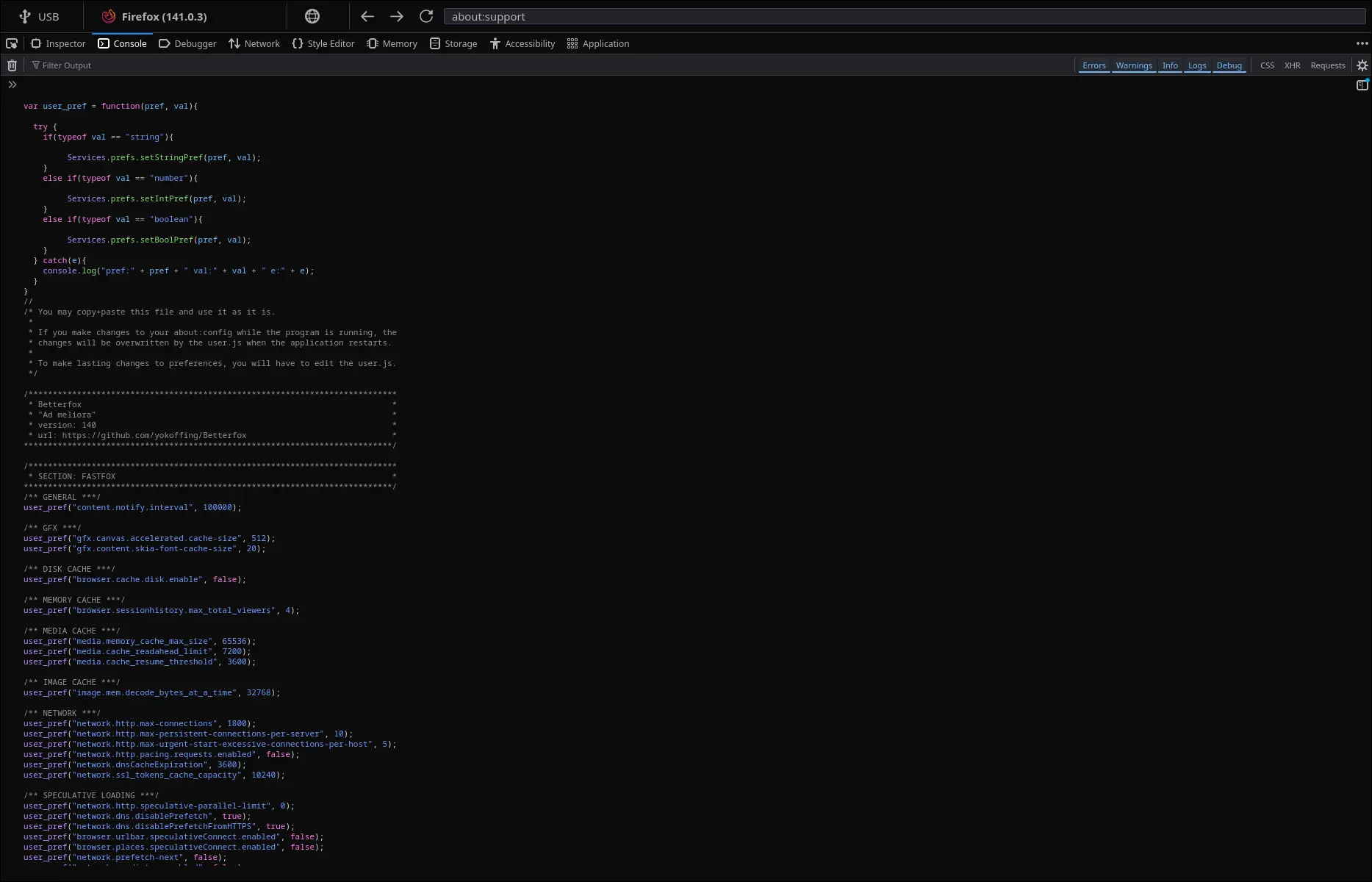 Now you can copy the user.js content of any flavor you want, like Arkenfox, Betterfox, etc., and paste it in the console like this:
